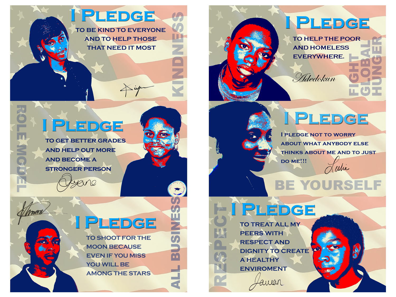 "I Pledge" in Adobe Photoshop Inspired by the Barack Obama “HOPE” portrait created by street artist Shepard Fairey and an MTV public service campaign called “I Pledge”, I created this Photoshop Project that was a big success and truly embraced by the students in my Web Design and Digital Graphics class. The images were displayed on digital flat screens in the lobby and lunchroom at Central Jersey College Prep Charter School. In addition to creating the graphic the students had to pledge to do something to improve their world.