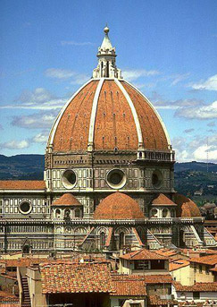 In 1418 Brunelleschi was paid to design the dome of the unfinished Gothic Cathedral of Florence. The dome was both artistically and technically a great breakthrough. It consists of two octagonal vaults, one inside the other. The way in which he designed the shape of the dome depended entirely on its functional needs as a piece of architecture. Brunelleschi made a design feature of the necessary eight ribs of the vault, carrying them over to the exterior of the dome, where they provide the framework for the dome’s decorative elements, which also include architectural reliefs, circular windows, and a beautifully proportioned cupola. This was the first time that a dome created the same strong effect on the exterior as it did on the interior.