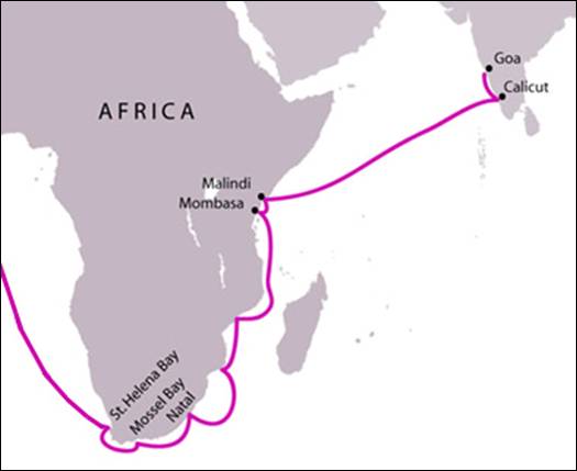(route). After many stops in Africa, and problems with Muslim traders who did